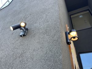 正面は、仕事で夜に車で帰宅するご主人の要望で車側と、玄関先の足元も照らせる可動式2Way照明。