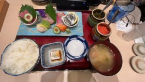 飛行機の待ち時間に定食屋「喜水丸」さんで刺身定食を食事。