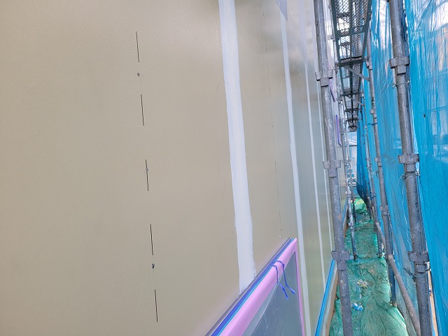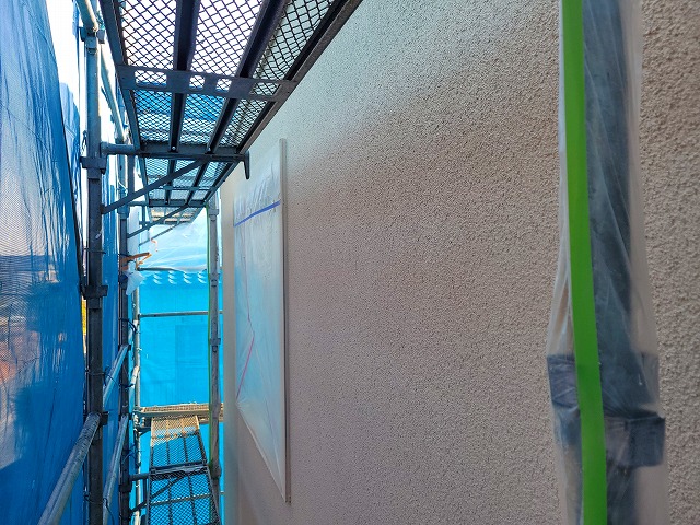 これから仕上げに入るジョリパット塗りに向けて、下地処理を行っています。ひび割れ防止や仕上がりの美しさを左右する重要な工程のため、下地の状態を一面ずつ確認しながら丁寧に施工しています。
