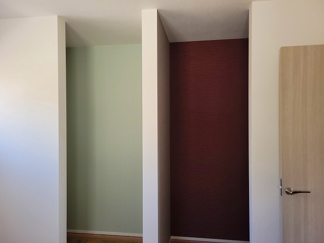 室内ではクロス施工が進んでいます。一部にアクセントクロスを取り入れることで、空間にメリハリが生まれ、お部屋の雰囲気がぐっと引き立っています。色や質感の違いがインテリアのポイントとなり、より魅力的な空間に仕上がってきました。