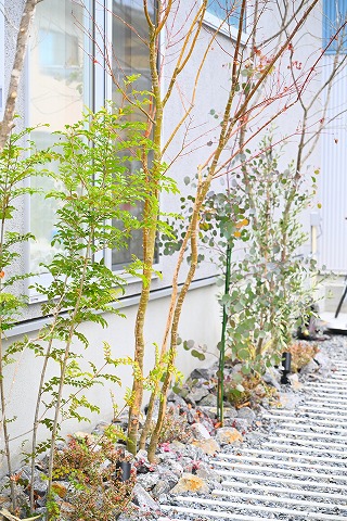 外構には木の素材を取り入れ、住まい全体をぬくもりのある印象に仕上げました。