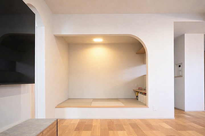 そこで、リビング横にヌックを設け、お子様の遊び場として計画🎨。現在ではおもちゃがリビング全体に広がることも少なくなり、気にならなくなったといいます。